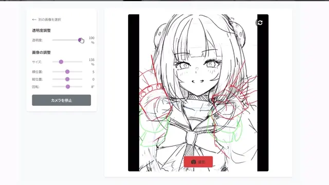 透明度、サイズ、位置、回転を調整して、ラフと実際の手が重なるようにします。準備ができたら「カメラを開始」ボタンをクリック。